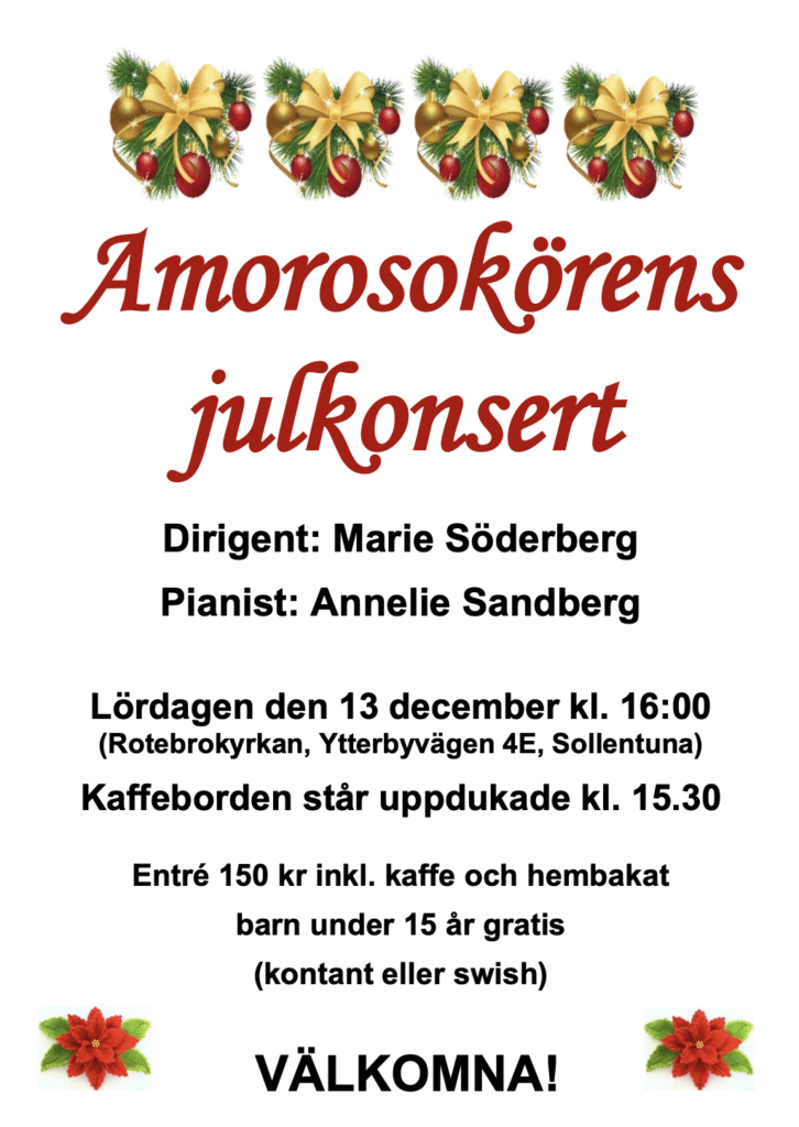 I höst har Amorosokören fått flera nya medlemmar, vilket vi är så glada för! Vi har haft en allsångskonsert, och nu repar vi inför vår julkonsert, som hålls den 13 december i Rotebrokyrkan. Hör av dig om du vill förköpa en biljett, det brukar vara fullsatt!